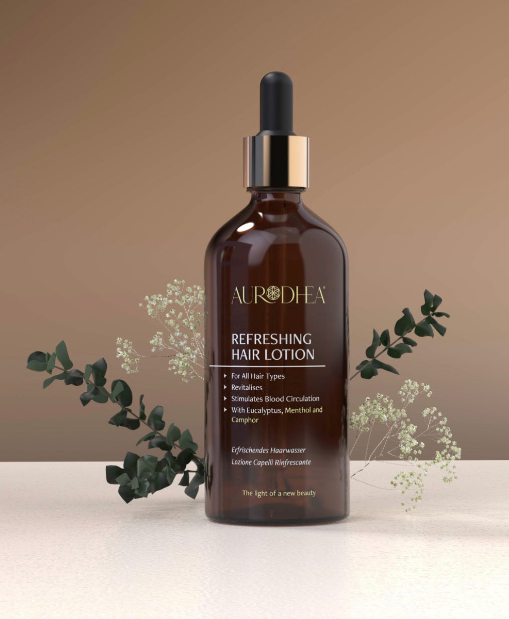 Das erfrischende Haarwasser von Aurodhea belebt und stärkt die Kopfhaut.